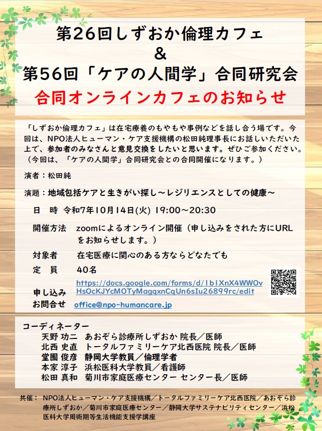 「しずおか倫理カフェ」は在宅療養のもやもや事例などを話し合う場です。今回は、NPO法人ヒューマン・ケア支援機構の松田純理事長にお話しいただいた上で、参加者のみなさんと意見交換をしたいと思います。ぜひご参加ください。