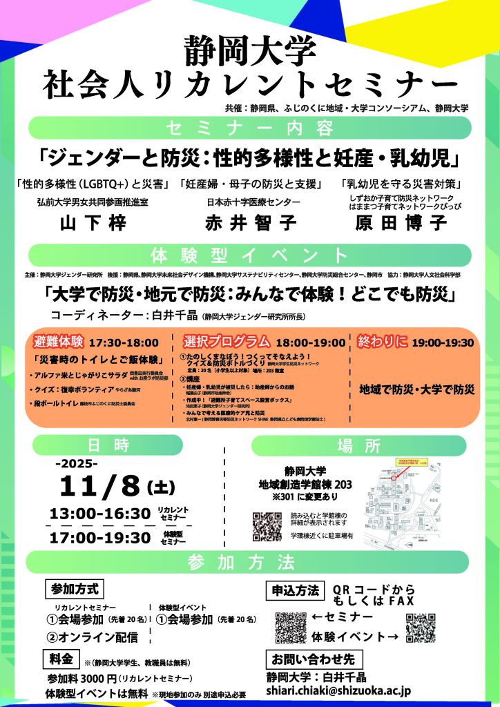 静岡大学ジェンダー研究所では昨年度「ジェンダーと防災」をテーマに、災害時の性暴力、母子避難所協定と実行力ある運営、子育て防災をテーマに連続勉強会を開催しました。今年度は人文社会科学部社会人リカレントセミナーとして性的多様性と妊産・乳幼児をテーマに開催します。LGBTQ+が災害時に直面することを通して見えてくる社会の課題、乳幼児や妊娠・出産した人や親子を守るために必要なことなど、誰も取り残さない、一人ひとりの防災を考え、検討しましょう。