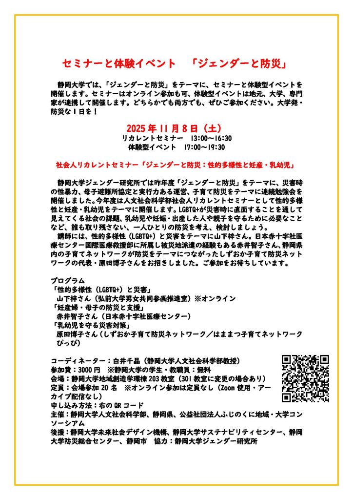 静岡大学では、「ジェンダーと防災」をテーマに、セミナーと体験型イベントを開催します。セミナーはオンライン参加も可、体験型イベントは地元、大学、専門家が連携して開催します。どちらかでも両方でも、ぜひご参加ください。大学発・防災な1日を!
