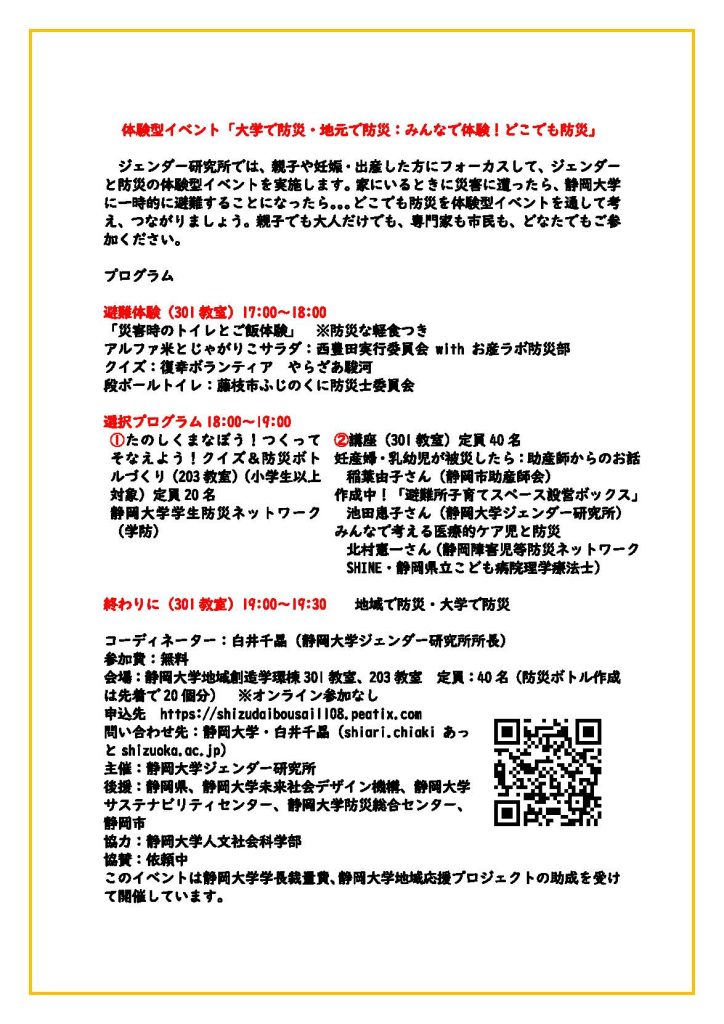 ジェンダー研究所では、親子や妊娠・出産した方にフォーカスして、ジェンダーと防災の体験型イベントを実施します。家にいるときに災害に遭ったら、静岡大学に一時的に避難することになったら。。。どこでも防災を体験型イベントを通して考え、つながりましょう。親子でも大人だけでも、専門家も市民も、どなたでもご参加ください。