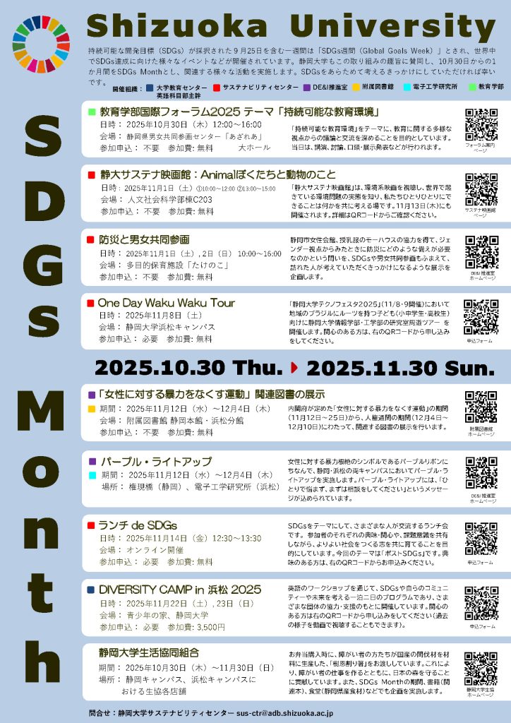 持続可能な開発目標(SDGs)が採択された9月25日を含む一週間は「SDGs週間(GLOBAL GOALS WEEK)」とされ、世界中でSDGs達成に向けたイベントなどが開催されています。静岡大学では、この取り組みの趣旨に賛同し、10月30日からの1ヶ月間を「SDGs Month」とし、静岡大学生活協同組合とも連携しながら、下記のイベント・取り組みを実施します。