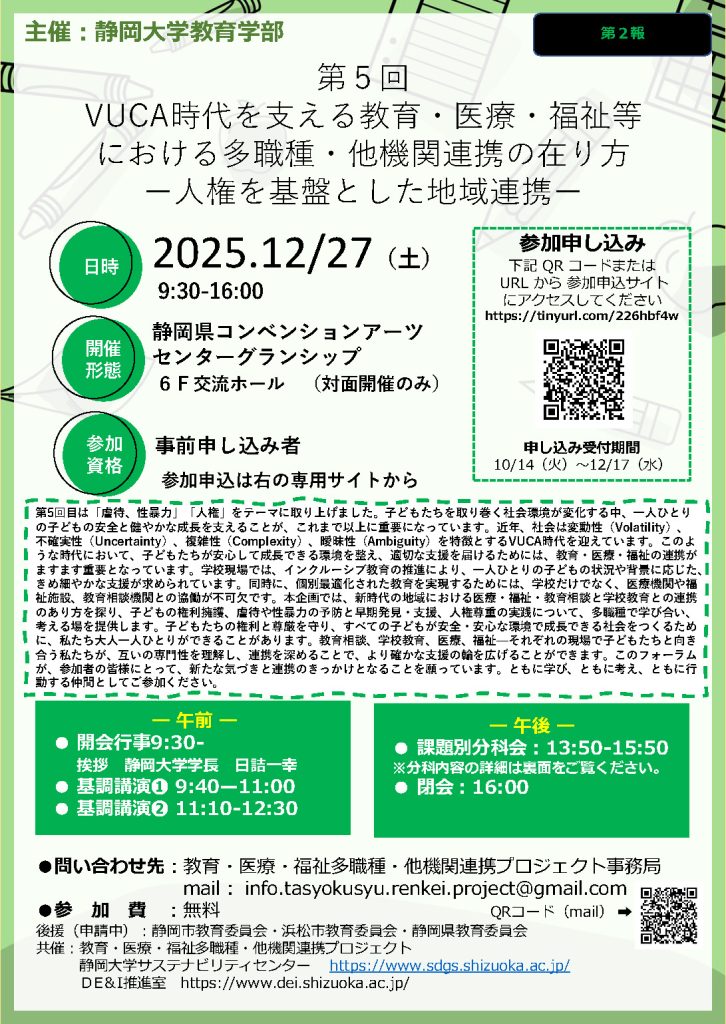 静岡大学では「第5回 VUCA時代を支える教育・医療・福祉等における多職種・他機関連携の在り方フォーラム」を下記の日時で開催予定です。