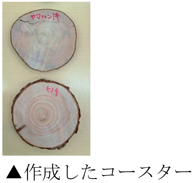 このイベントでは、本学教員による講義に加え、参加者自身が演習林の木をカットしてコースターを作る体験をしました。針葉樹と広葉樹の堅さの違いを感じながら、汗を流して懸命にノコギリを引いていました。その後、本学教員が開発した樹木探索アプリ「Find-tree」を使って、指定された3種の樹木を見つけに構内を散策しました。学生たちの案内もあり、全員目的の樹種を見つけることができました。