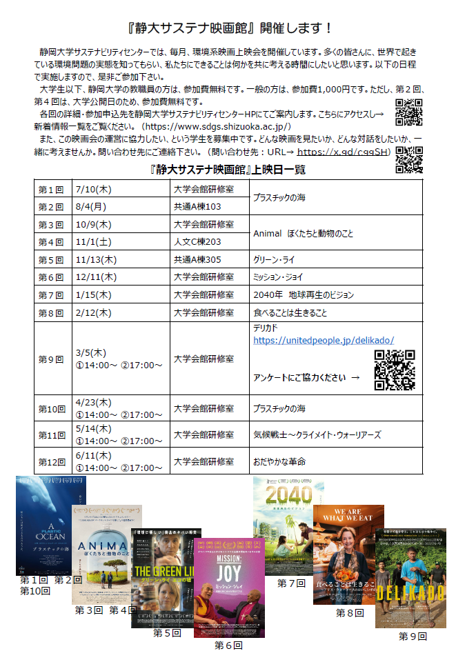 「静大サステナ映画館」は、環境系映画を視聴し、世界で起きている環境問題の実態を知り、私たちひとりひとりにできることは何かを共に考える場です。