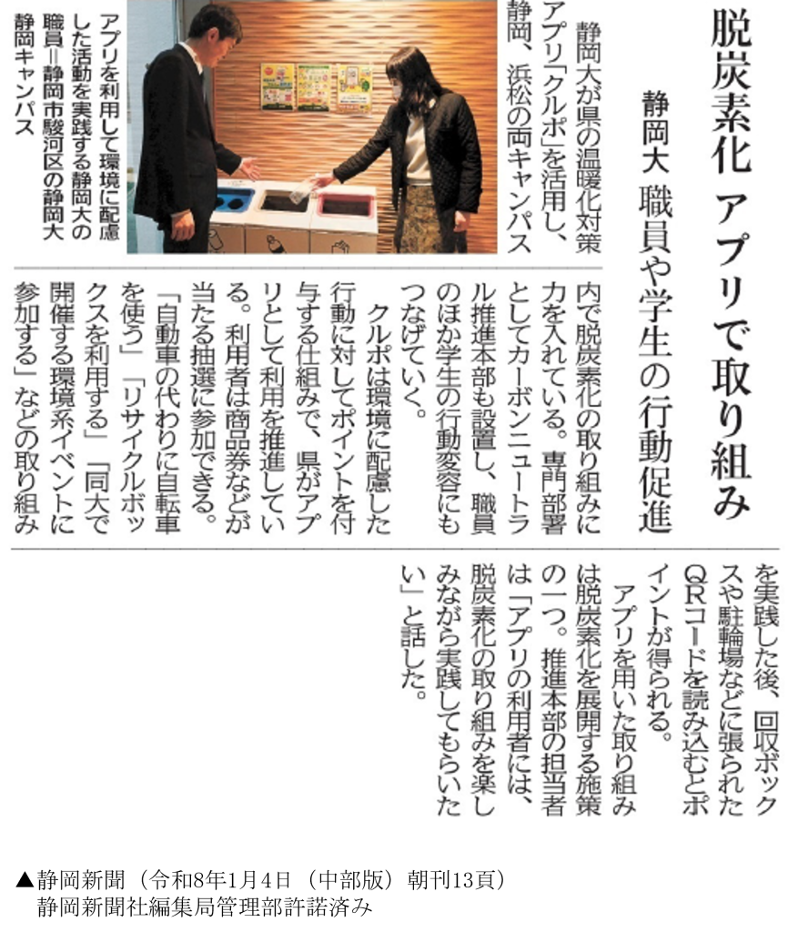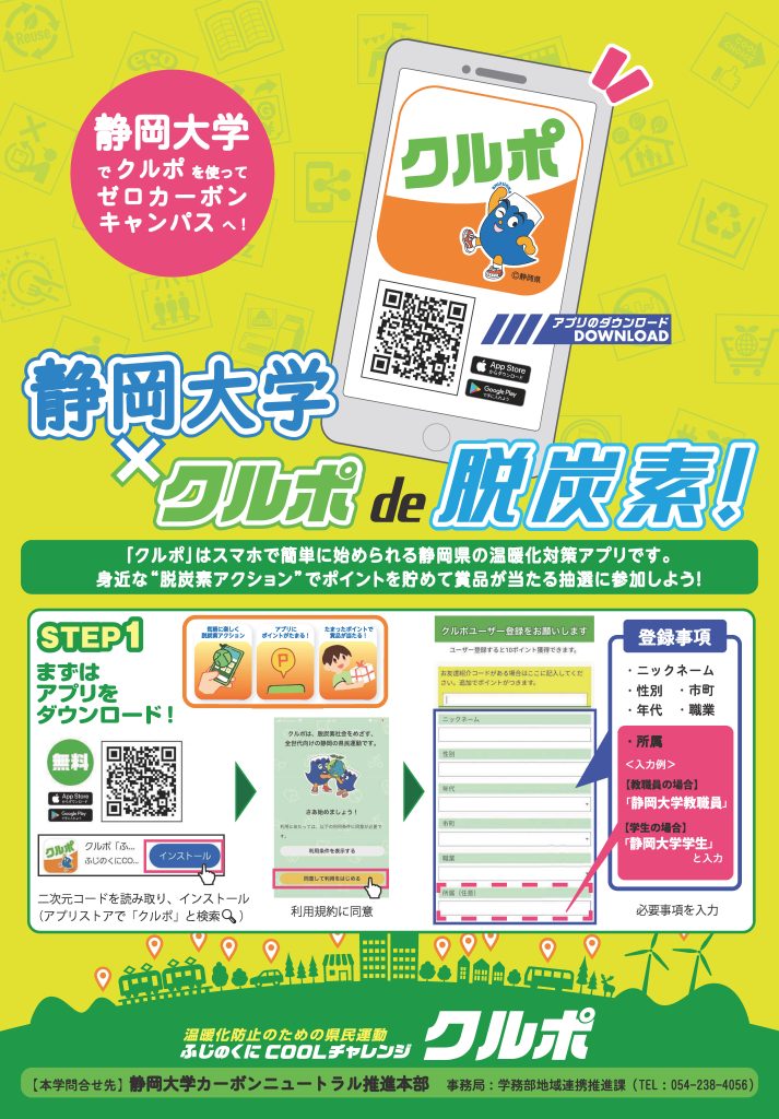 静岡大学は、ゼロカーボンキャンパスの推進に向け、本学構成員がより身近に楽しみながら学内外において温室効果ガス削減に取組むことができるよう、本学キャンパス内で行われている各種の脱炭素アクション(環境に配慮した行動)を「クルポ」のクルポスポットとして登録しました。
