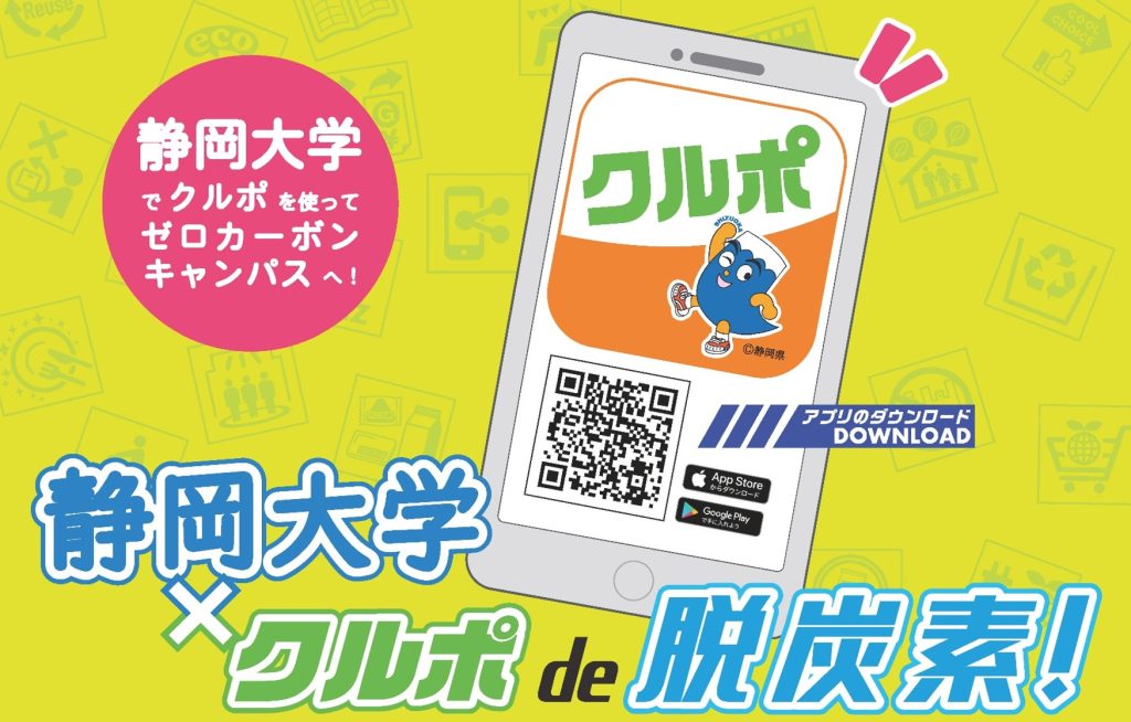 静岡大学は、ゼロカーボンキャンパスの推進に向け、本学構成員がより身近に楽しみながら学内外において温室効果ガス削減に取組むことができるよう、本学キャンパス内で行われている各種の脱炭素アクション(環境に配慮した行動)を「クルポ」のクルポスポットとして登録しました。