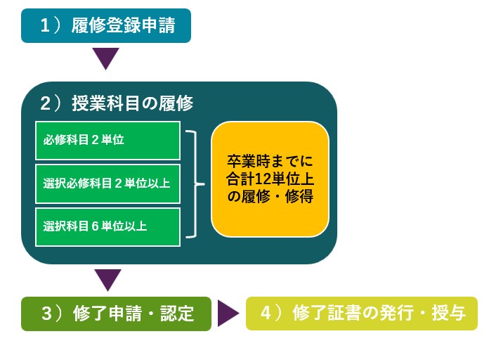 _必修科目2単位、選択必修科目4単位以上、選択科目6単位以上、合計12単位以上を取得すれば、プログラムの修了が認定されます。